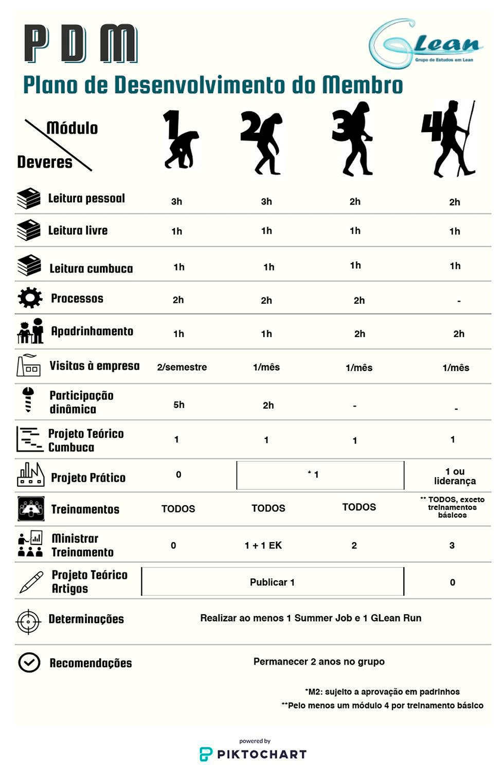 Os módulos três e quatro concentram-se na consolidação de conhecimento através de projetos práticos, disseminando o conhecimento adquirido por meio da mentoria dos módulos mais novos e atuando na liderança estratégica do grupo. Para suprir as necessidades de aprendizado e desafios de cada módulo, foi criado o Plano de Desenvolvimento do Membro, que explicita as atividades básicas para que o membro se capacite no “Padrão GLean”.