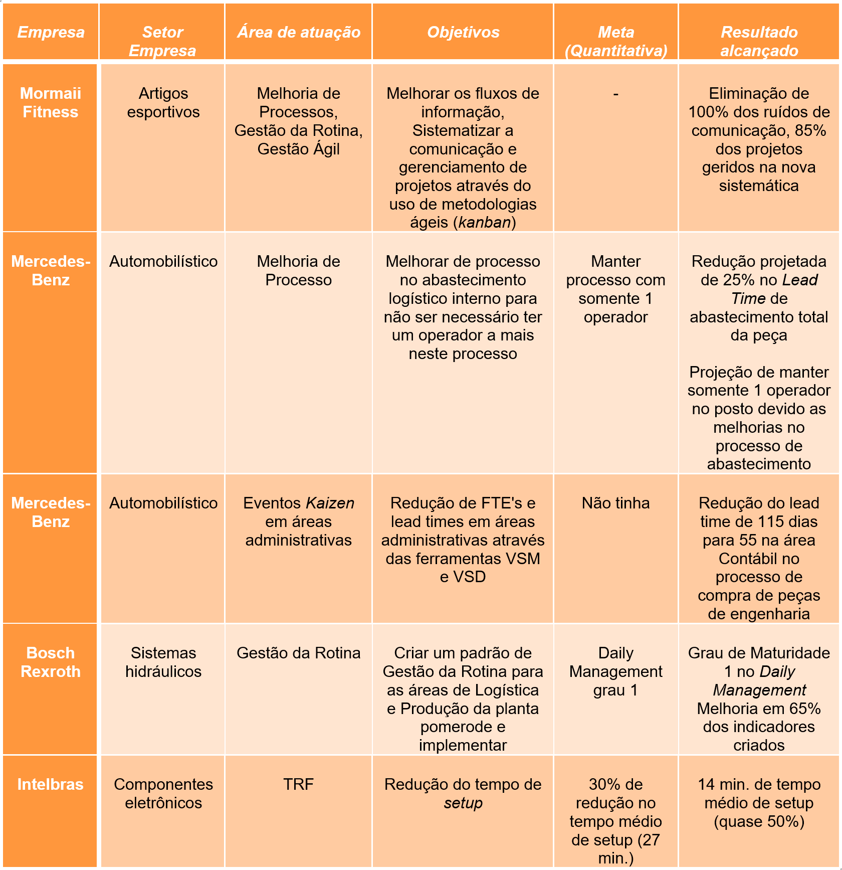 Com relação aos estágios de verão, foi atingido um patamar de excelência ao executar projetos em empresas de referência na manufatura, como Mercedes-Benz, Nestlé, Zen, Bosch-Rexroth e Malwee. Essa conquista veio como reconhecimento da capacidade do grupo de aprender e aplicar em empresas de impacto nacional e internacional. Alguns resultados expressivos que o GLean ajudou a construir foram: