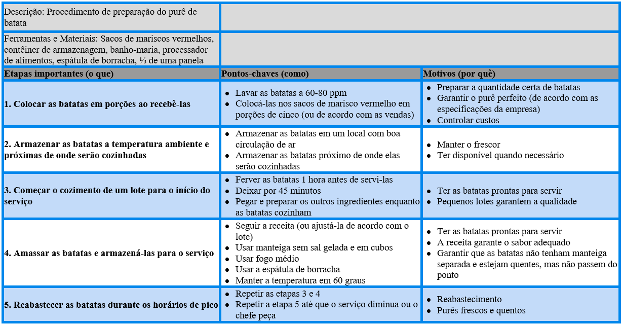 Esta é uma Folha de Detalhamento do Trabalho desenvolvida em um restaurante da Legal Sea Foods para garantir o treinamento adequado e eficaz de novos procedimentos de trabalho e para garantir que eles sejam claramente entendidos. Essa abordagem também permite a solução de problemas em torno da própria rotina de trabalho.